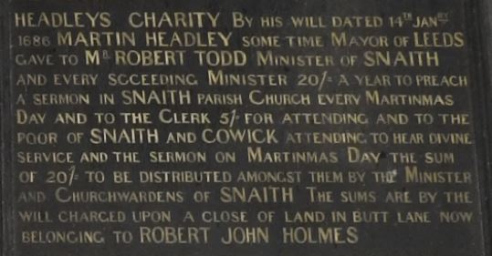 Headley was undoubtedly a good friend to Snaith, leaving a number of bequests to the Church in his will of 1686. He bequeathed to Mr Robert Todd, Minister of Snaith, and to every succeeding Minister, 20/- a year to preach a sermon every Martinmas Day, and 5/- to the Clerk for attending. In addition, every member of the poor of Snaith and Cowick who attended this service was to receive a share of 20/-, to be distributed amongst them by the Minister and Churchwardens.
